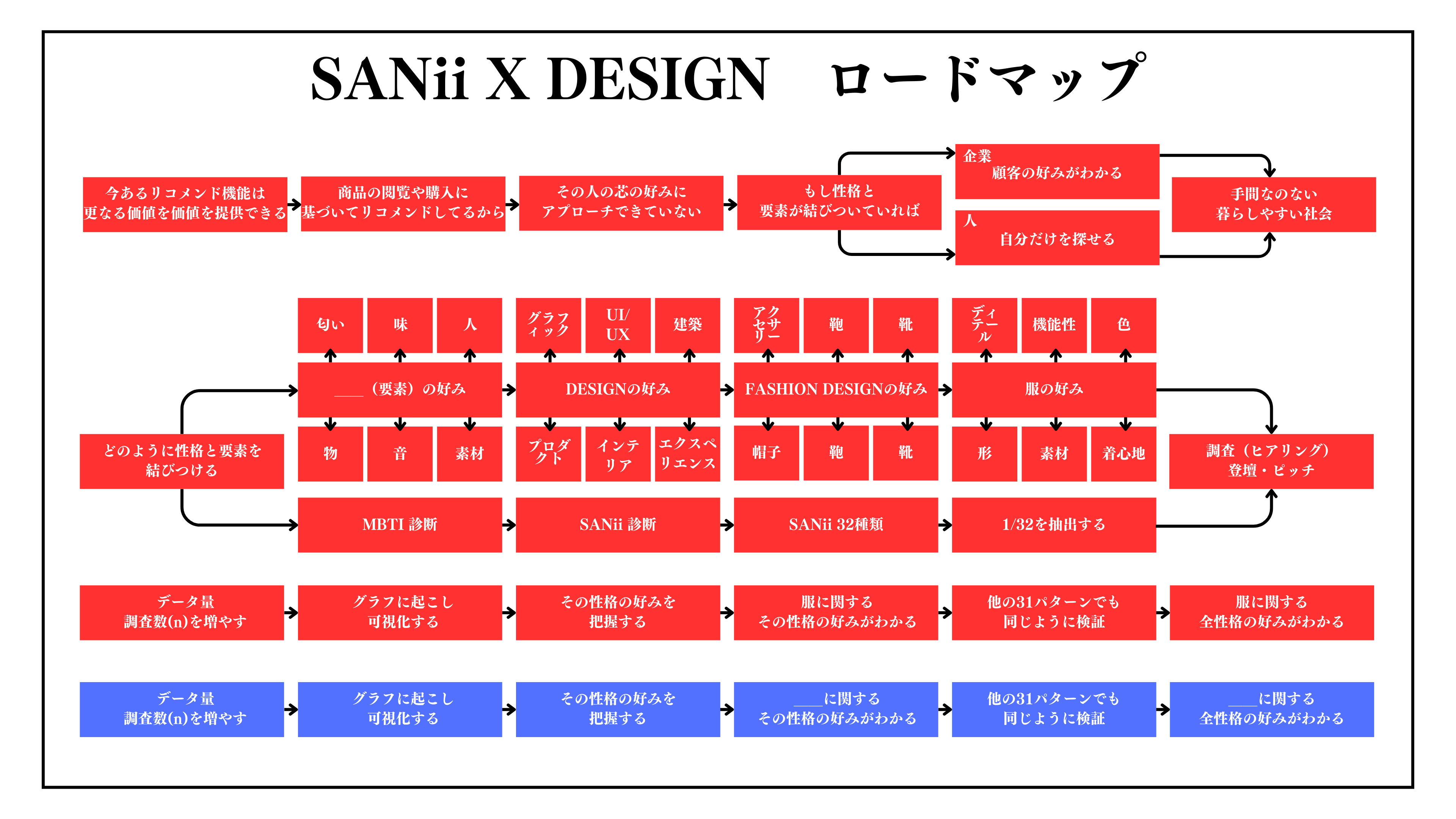 MBTI 16 種類を土台に、方向性の掛け合わせで 32 種類の "SANii" を定義。そこから 1 人の 1/32 を抽出し、その人固有の好みをデザインへ翻訳する構想。